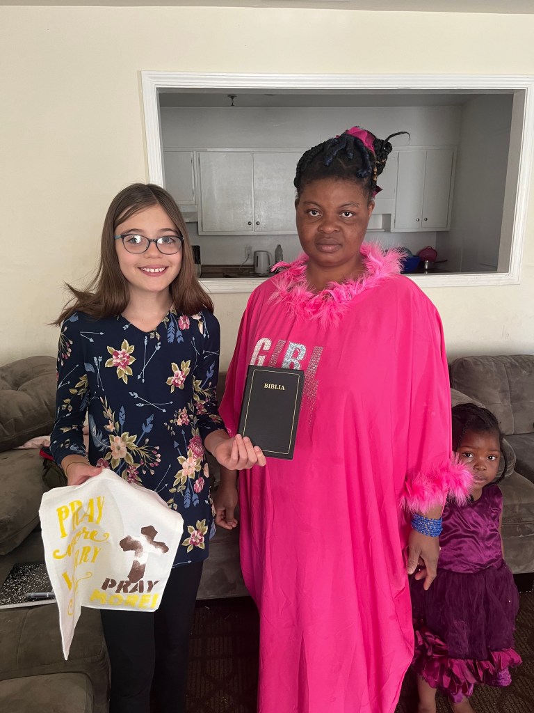 One day, my dad brought her some furniture for her apartment. She speaks Spanish. He asked her if she has a Spanish Bible and she said no, but she wants one. She has two daughters, and she said even her daughters want a Bible in English. So, another day I went there and delivered a Spanish Bible for Cassandra and an English Bible for her girls.