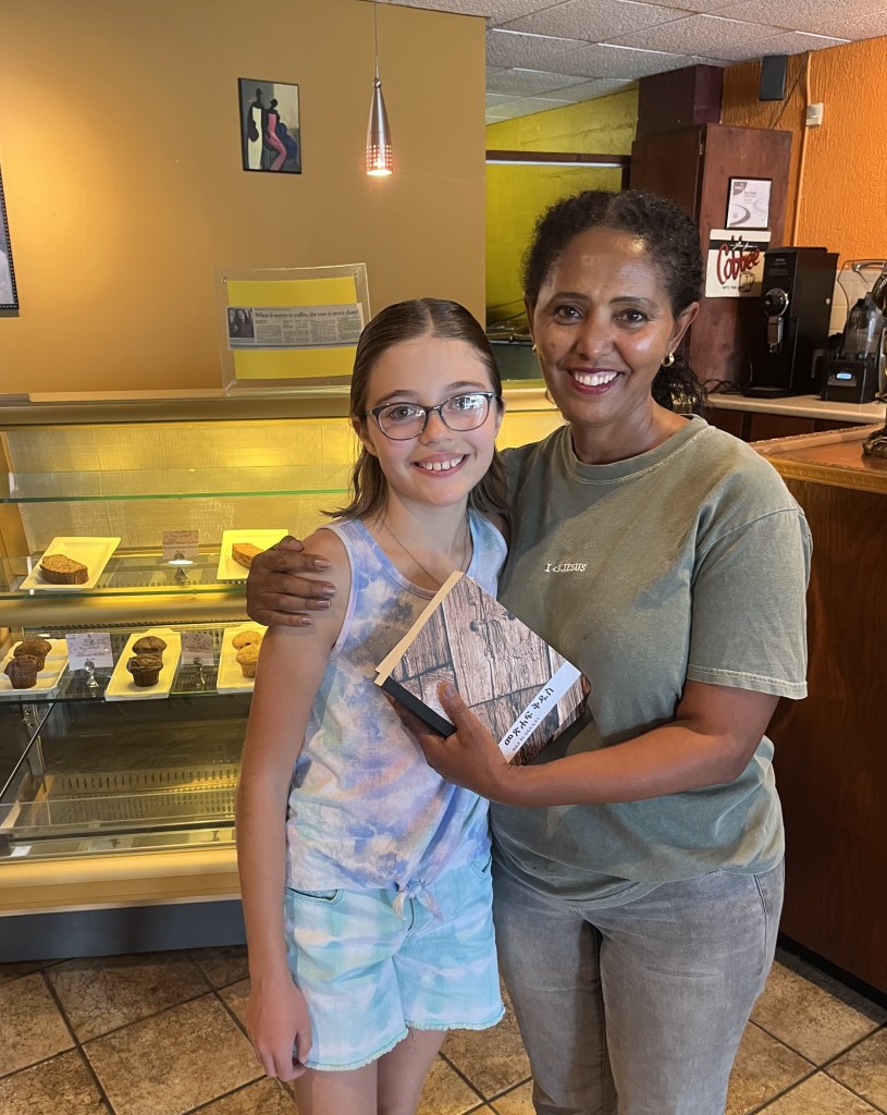 Today I visited Mrs. Selam. She and her husband own a coffee shop. They are really nice and my dad likes to go there for espresso and I always get vanilla crème. They have a lot of books there and people come and drink coffee or work or they just sit and talk together. It’s a popular place.